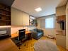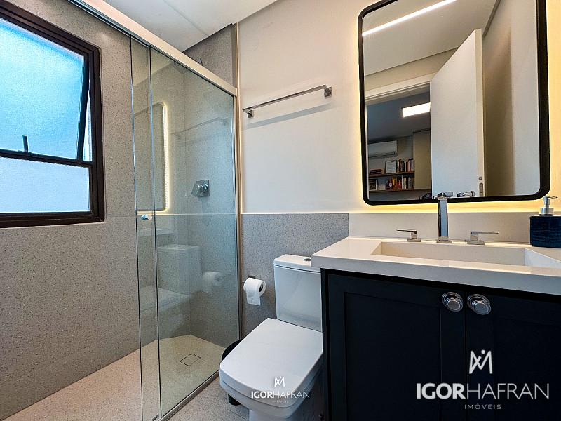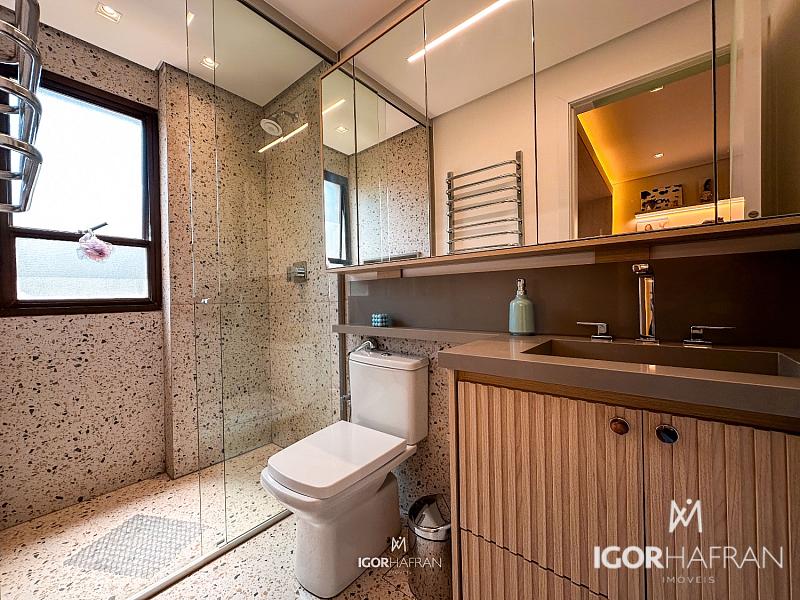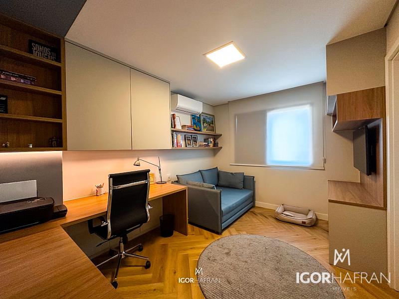 São três suítes, todas espaçosas e elegantemente decoradas, com destaque para a suíte master: um refúgio particular com varanda, closet generoso e banheiro espaçoso. O home office planejado garante funcionalidade sem abrir mão da estética.